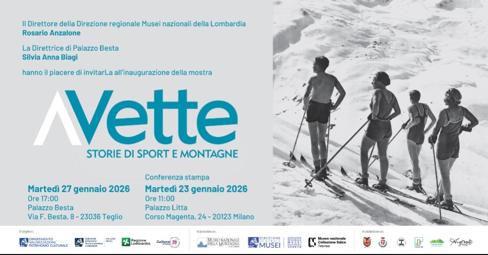 Dal 28 gennaio al 30 agosto 2026 a Palazzo Besta di Teglio la mostra “VETTE. Storie di sport e montagne”, tra Olimpiadi, paesaggio alpino, identità culturale e sport invernali, nel programma dell’Olimpiade Culturale Milano Cortina 2026.