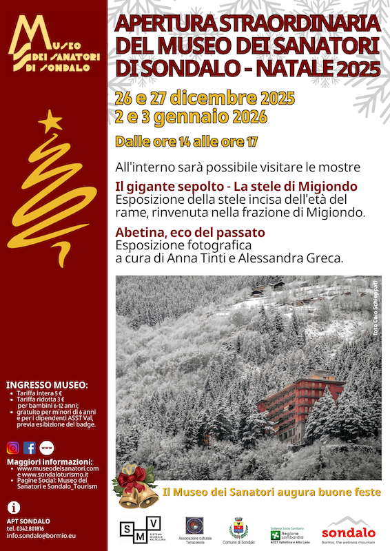 Apertura straordinaria del Museo dei Sanatori di Sondalo il 26-27 dicembre 2025 e 2-3 gennaio 2026 dalle 14 alle 17, con le mostre “Il gigante sepolto – La stele di Migidondo” e “Abetina, eco del passato”.