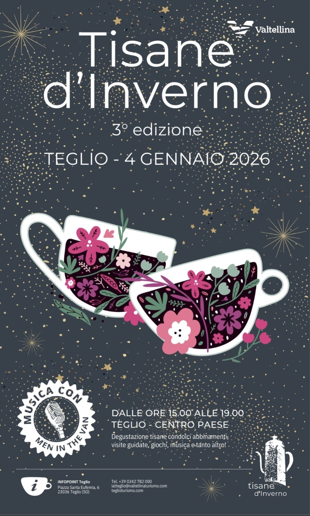 Domenica 4 gennaio 2026 torna a Teglio “Tisane d’Inverno”: degustazioni di tisane Raselli Bio, musica, visite guidate e intrattenimento nel centro storico.