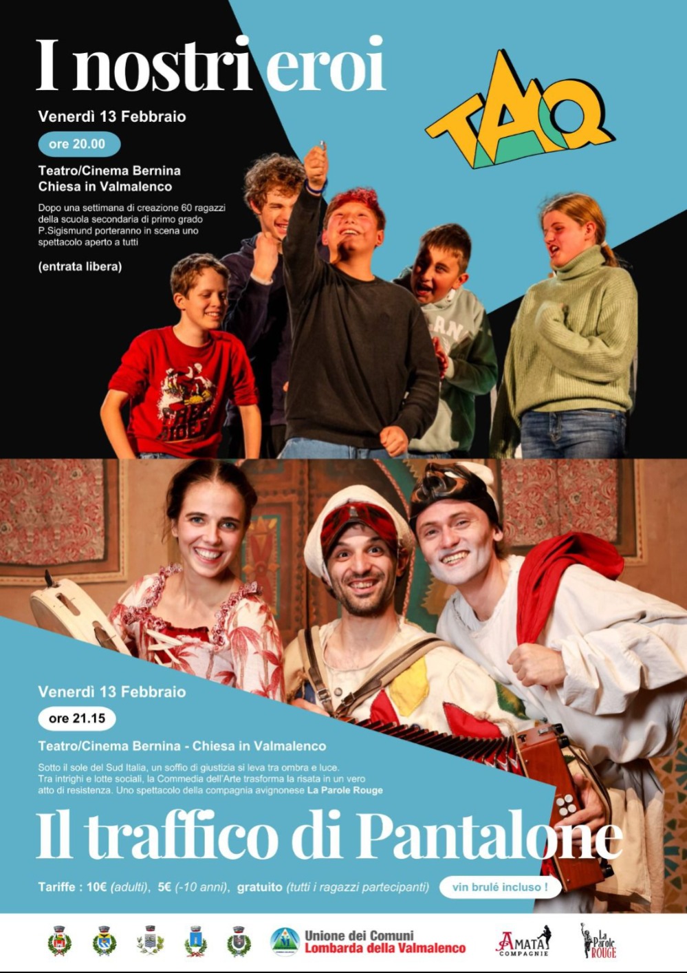 On Friday, February 13, 2026, at the Teatro/Cinema Bernina in Chiesa in Valmalenco, the atmosphere of Carnival returns with two shows: “I nostri eroi,” performed by local students, and “Il traffico di Pantalone” by the French company La Parole Rouge. An evening of theater, culture, and celebration for the whole community.