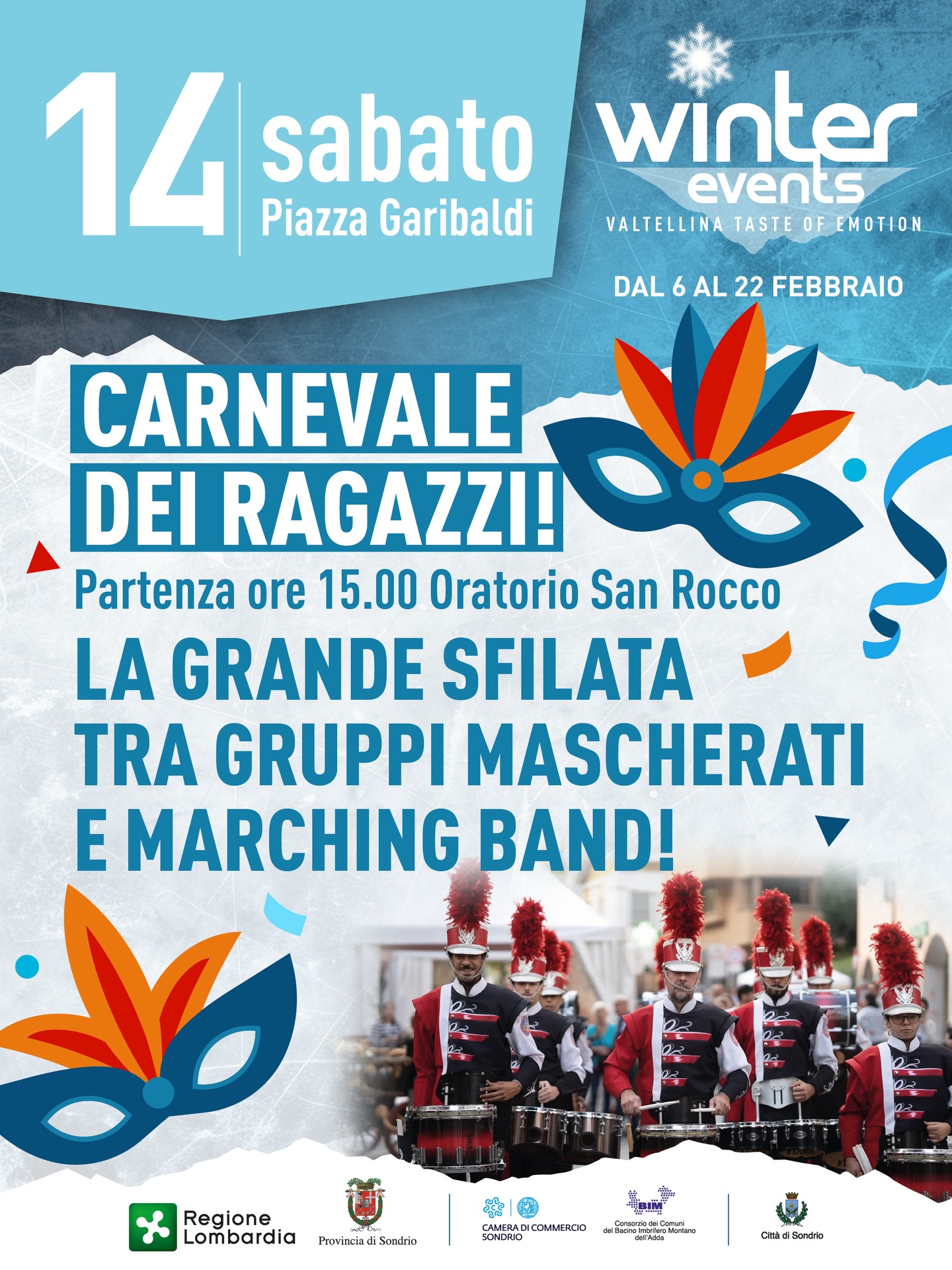 from 3:00 PM / Departure from Oratorio San Rocco CARNIVAL OF KIDS THE GREAT PARADE WITH COSTUMED GROUPS AND MARCHING BAND