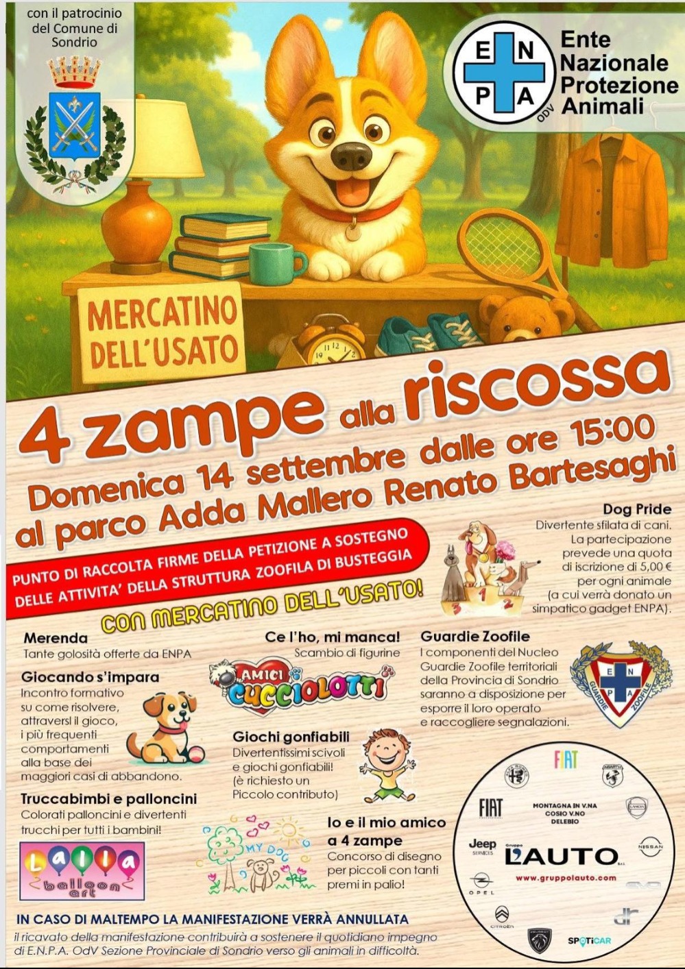 Domenica 14 settembre 2025 il Parco Adda Mallero Renato Bartesaghi di Sondrio (SO) ospita “4 Zampe alla Riscossa”, un evento firmato ENPA pensato per unire divertimento e sensibilizzazione.