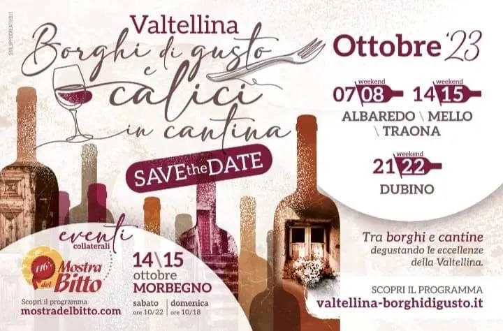 Questo è Borghi di gusto e Calici in cantina, che si terrà tra Albaredo per San Marco, Mello, Traona e Dubino nelle seguenti date: 7,8,14,15,21 e 22 ottobre