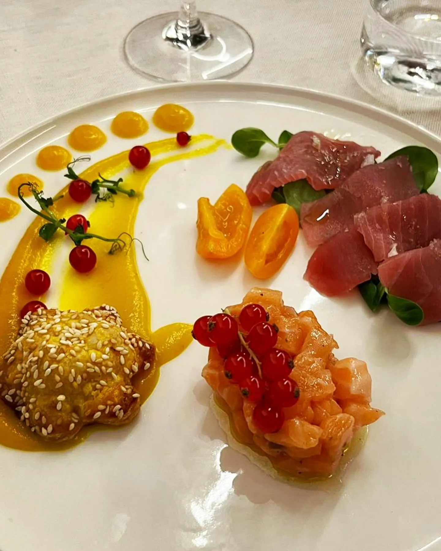 Tartare di branzino all'olio di mirto e salsa di melograno
