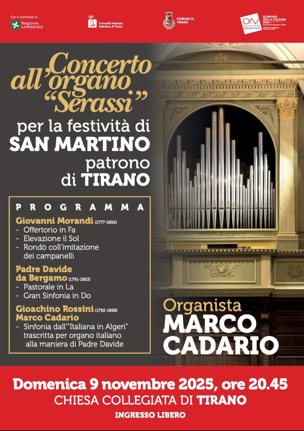 Il protagonista sarà Marco Cadario, organista di livello internazionale, che proporrà un programma musicale di grande fascino. In scaletta, opere di Giovanni Morandi, Padre Davide da Bergamo, Gioachino Rossini e una speciale trascrizione per organo della celebre “Italiana in Algeri”, interpretata alla maniera di Padre Davide.