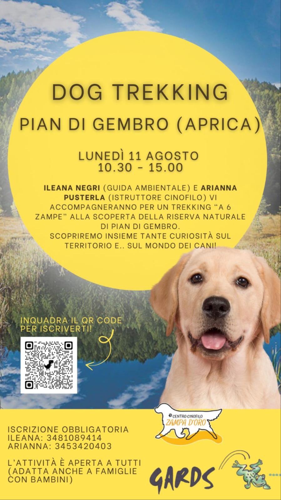 Vuoi vivere un'esperienza nuova, divertente e istruttiva insieme al tuo cane? Allora segna questa data: lunedì 11 agosto, dalle 10.30 alle 15.00, al Pian di Gembro (SO), ti aspetta un trekking speciale, pensato per chi ama la natura e gli amici a quattro zampe.