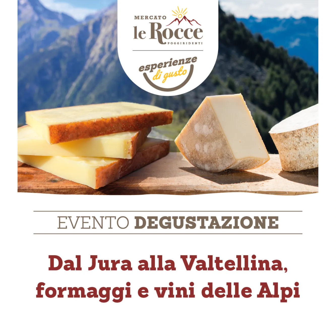 Tornano le Esperienze di gusto al mercato Le Rocce di Poggiridenti: appuntamento venerdì 26 luglio alle 20 per la serata Dal Jura alla Valtellina, formaggi e vini delle Alpi.