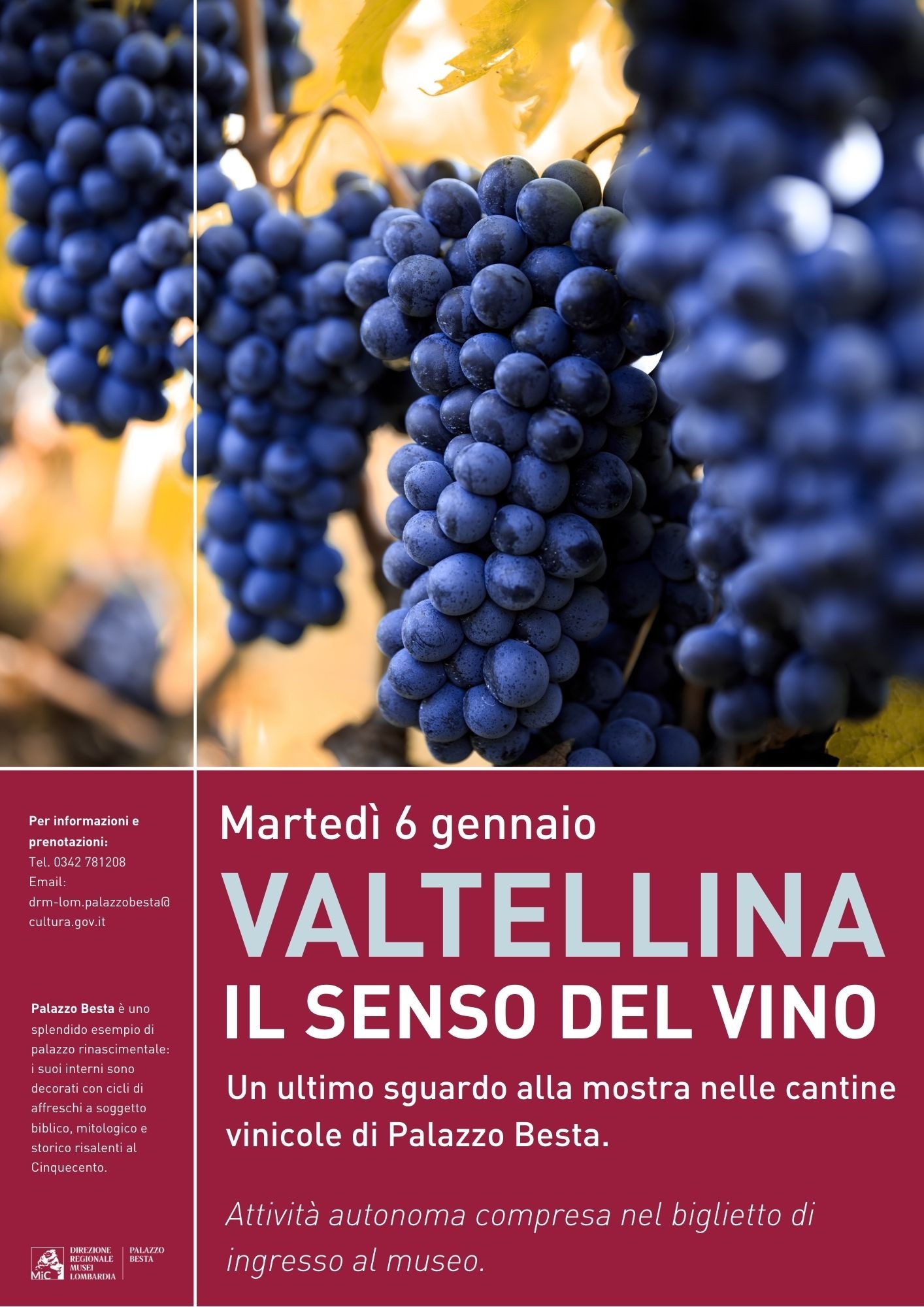 Un ultimo sguardo alla mostra ospitata nelle cantine vinicole di Palazzo Besta, dedicata al profondo legame tra il territorio valtellinese e la cultura del vino. Un percorso che racconta tradizione, paesaggio e identità, ideale per concludere le festività con una visita di grande fascino.