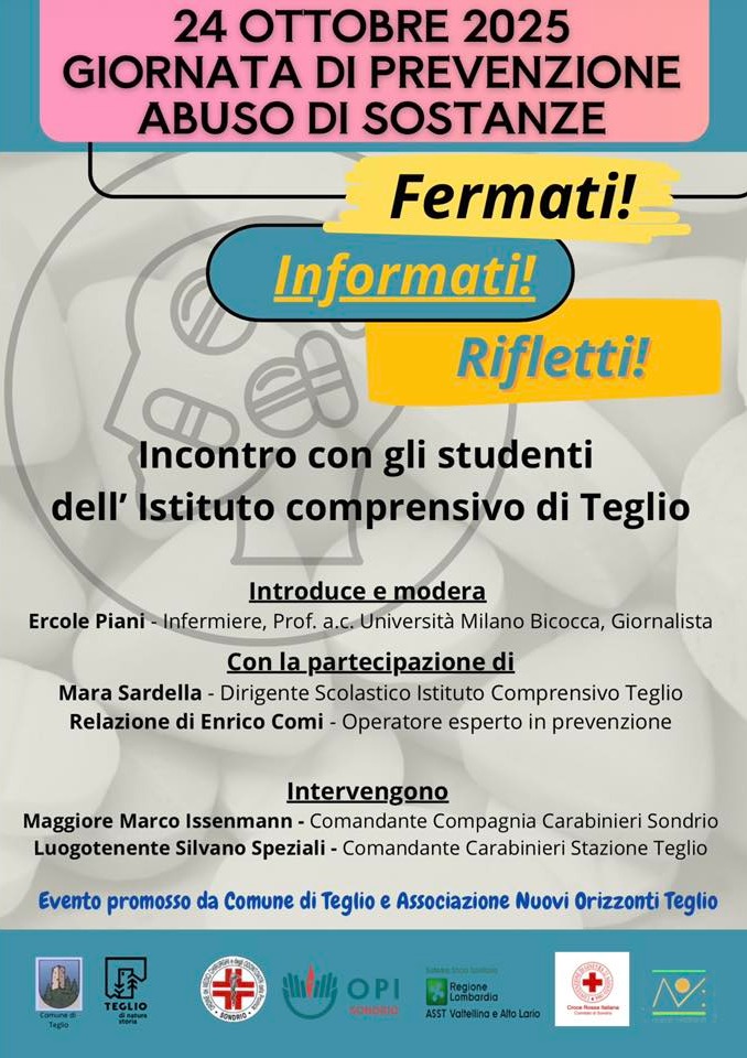 Venerdì 24 ottobre 2025, alle ore 20:30, ti aspetta un incontro pubblico di grande valore al Salone dell’Oratorio di Teglio (SO): una serata di confronto, riflessione e informazione sull’abuso di sostanze, rivolta a tutta la cittadinanza.
