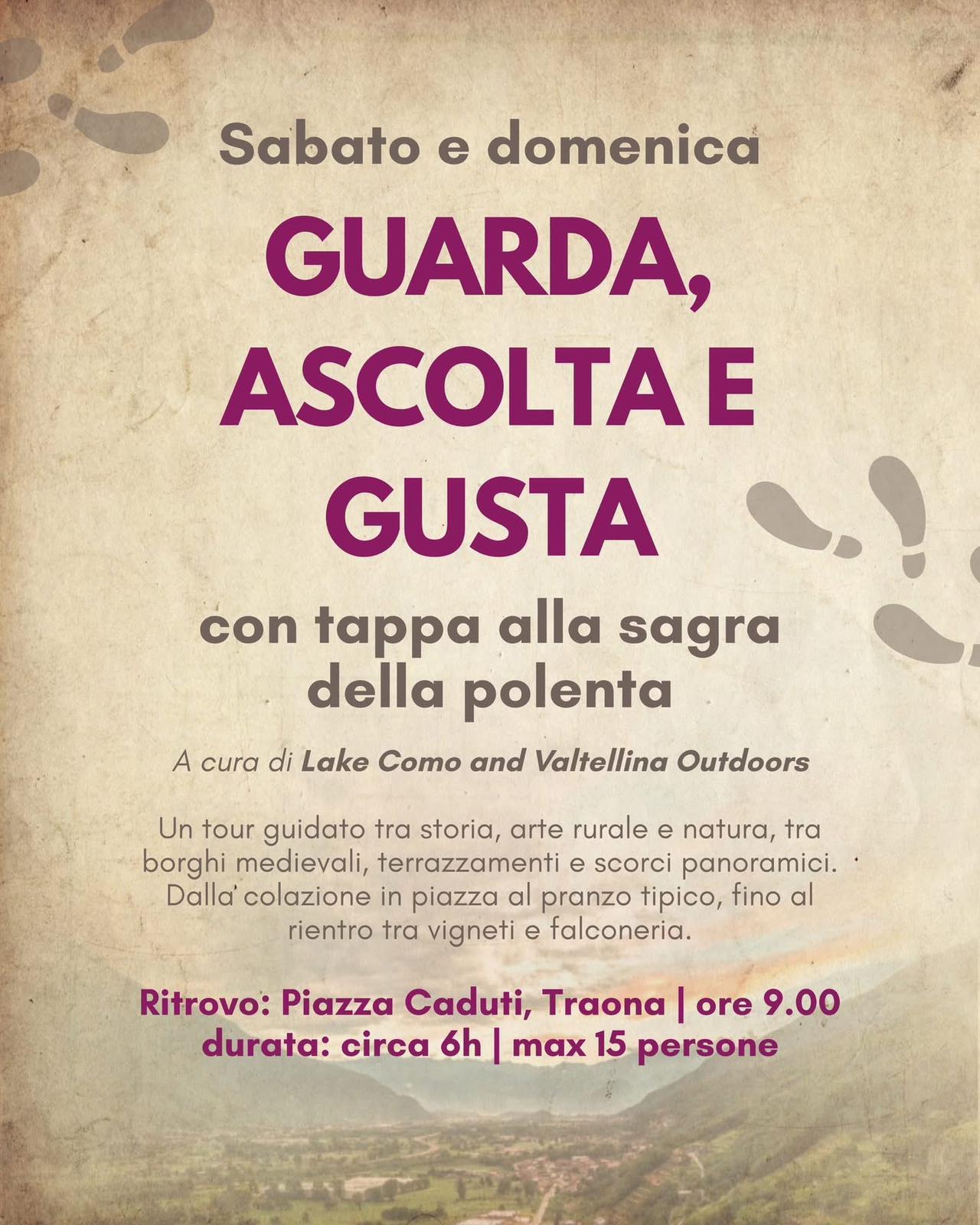 Per due giorni Traona, Cino e Cercino diventano il cuore di un percorso tra panorami vista lago, terrazzamenti vitati, storia locale e sapori del territorio. La manifestazione invita a camminare sul sentiero dei tre borghi e propone passeggiate, tour in e-bike, sagre, degustazioni e tanti appuntamenti pensati per valorizzare la Costiera dei Cech e le sue tradizioni.