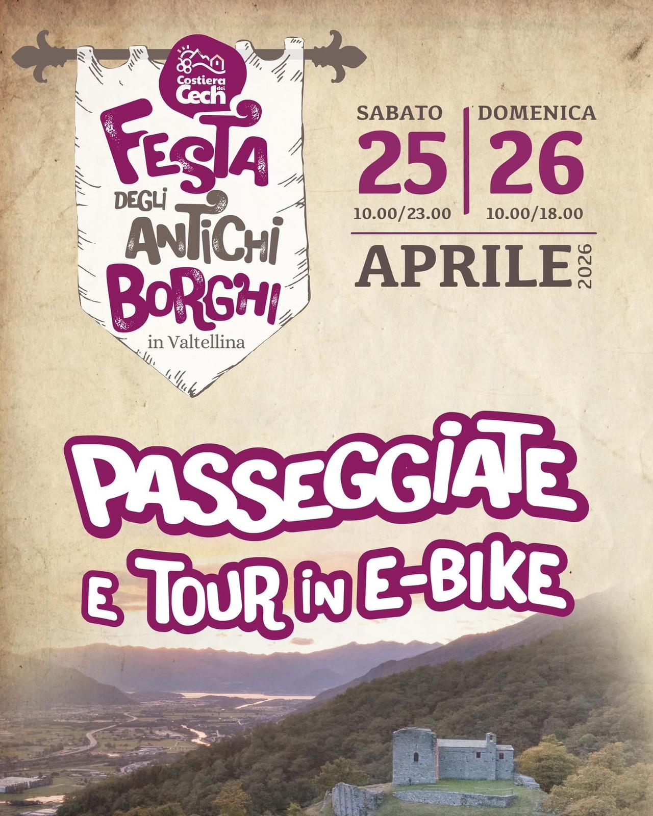 Il programma mette insieme rievocazioni storiche diffuse, accampamenti, antichi mestieri, falconeria, dimostrazioni di combattimenti e arcieri, laboratori per famiglie e bambini, visite guidate a chiese, palazzi storici e cantine con degustazioni, oltre a escursioni a piedi e in bici e momenti con giullari, canti e danze rinascimentali. L’evento è inoltre anticipato venerdì 24 aprile alle 20.30 da un convegno dedicato a Cech-In e alle prospettive del territorio.