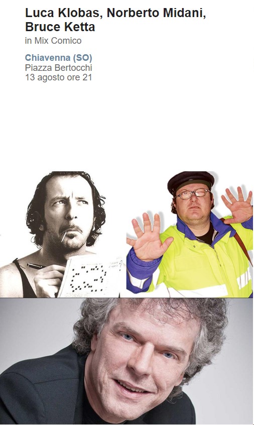 spettacolo di cabarat "Mix comico" di Luca Klobas, Norberto Midani, Bruce Ketta in programma dalle 21 in piazza Bertacchi.