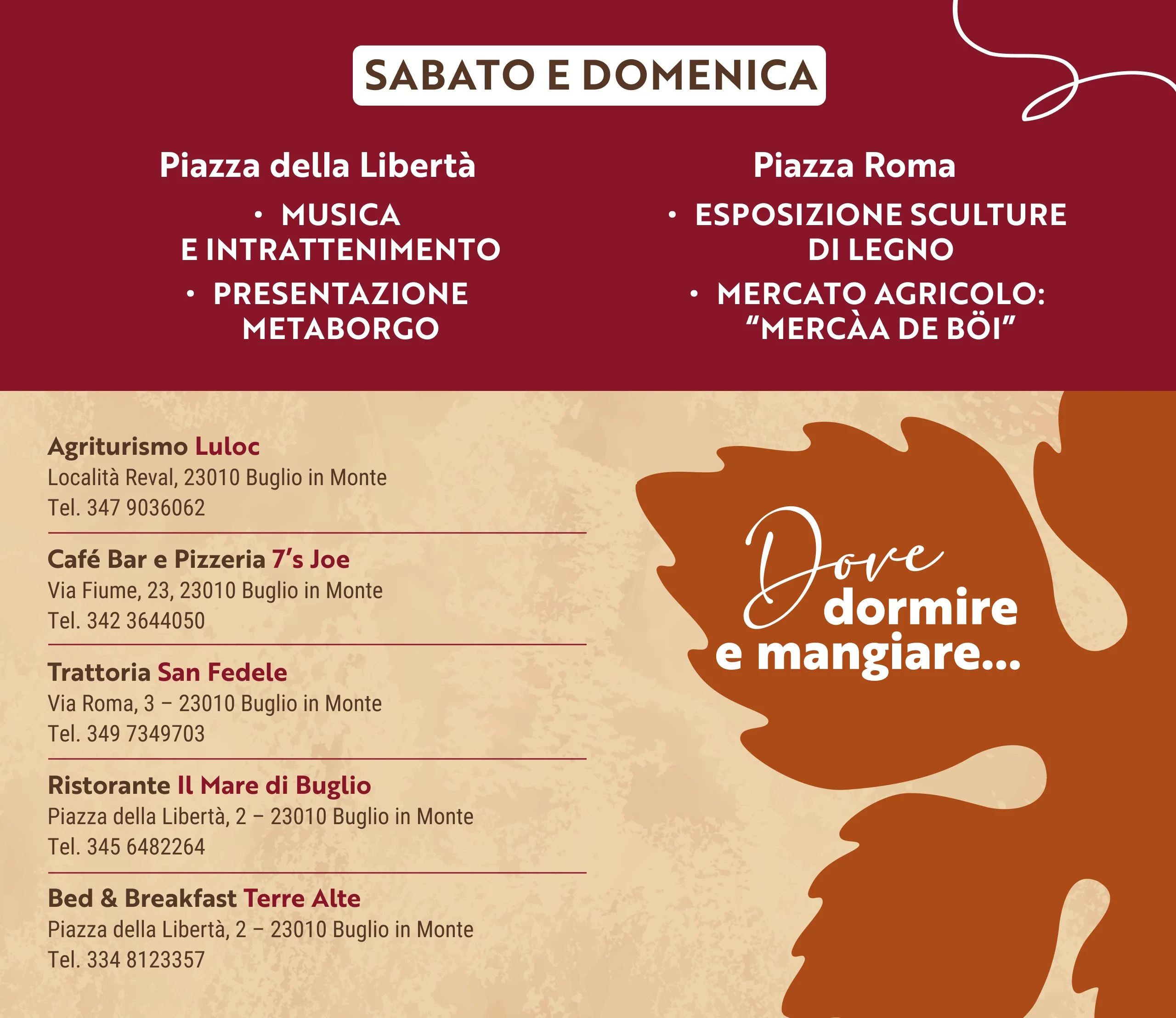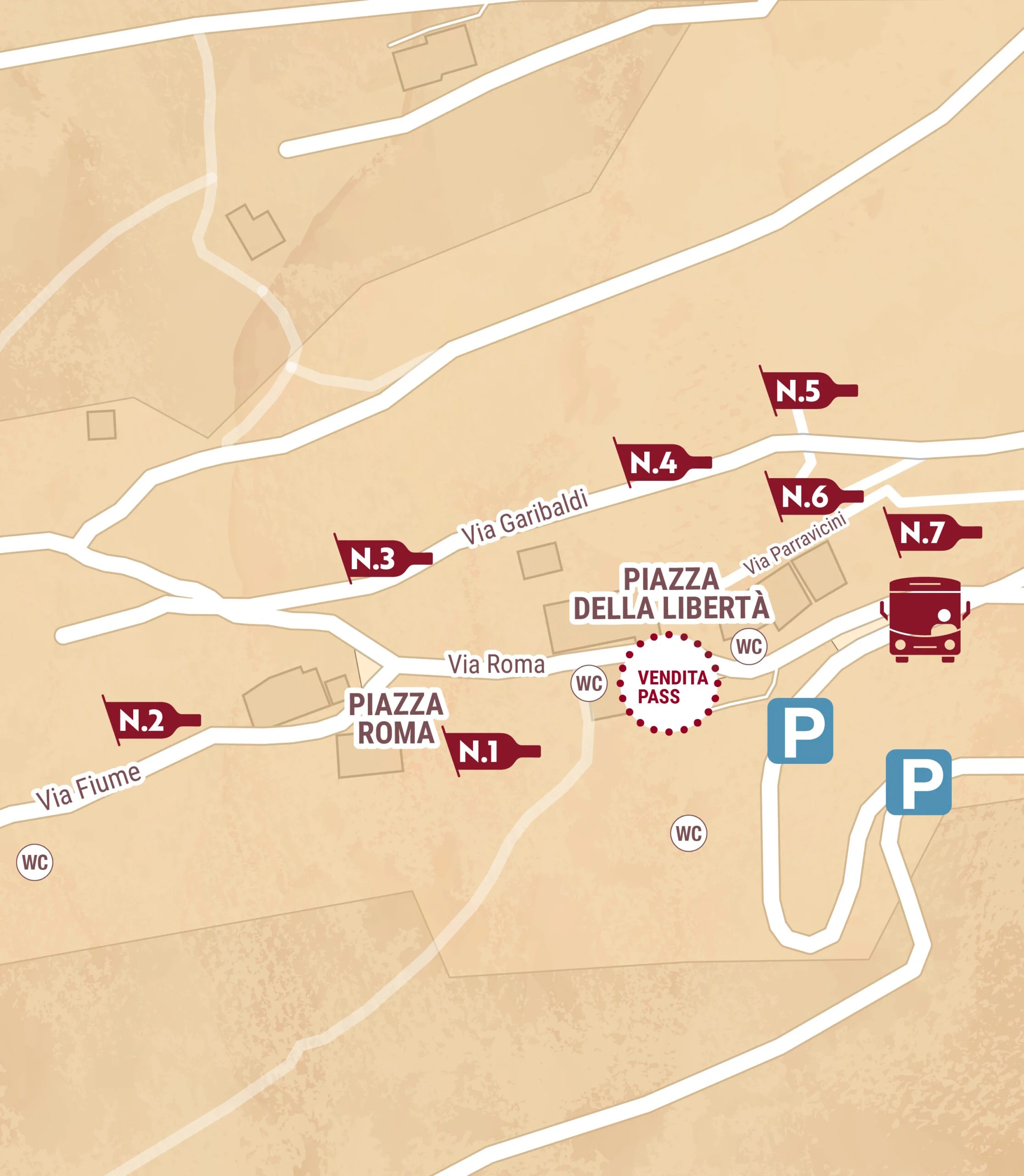 Il centro del paese accoglierà un percorso enogastronomico con più tappe numerate (N.1 – N.7), dislocate tra Piazza della Libertà e Piazza Roma, con stand, cantine e spazi culturali.