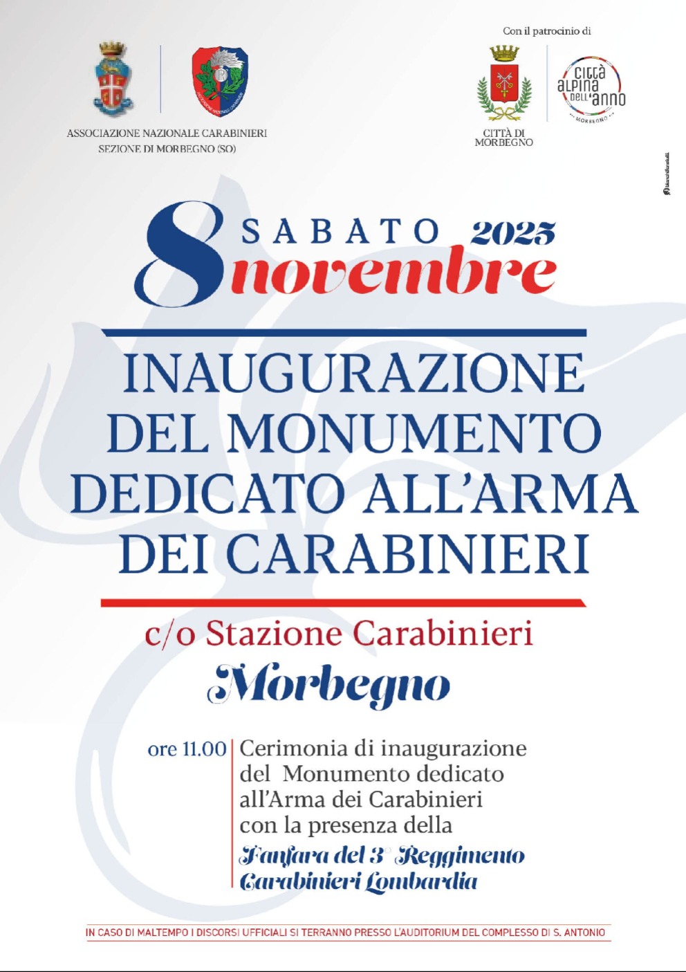Un evento di grande significato simbolico e istituzionale. A Morbegno (SO), sabato 8 novembre alle ore 11.00, si svolgerà la cerimonia di inaugurazione del monumento dedicato all’Arma dei Carabinieri, alla presenza della Fanfara del 3° Reggimento Carabinieri Lombardia.