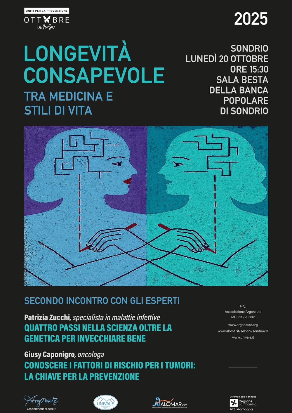 Lunedì 20 ottobre 2025 torna a Sondrio il secondo appuntamento del ciclo “Longevitá Consapevole – Tra medicina e stili di vita”, un’iniziativa dedicata alla prevenzione e al benessere, parte del progetto Ottobre in Rosa 2025.