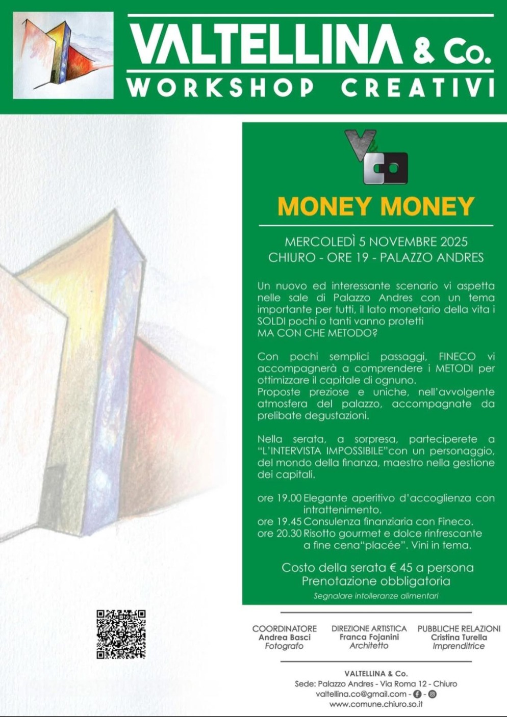 "Money Money" è il titolo del prossimo appuntamento di Valtellina & Co. Workshop Creativi, che ti porta tra le eleganti sale di Palazzo Andres per affrontare un tema che riguarda tutti: i soldi. Pochi o tanti, non importa. Quello che conta è come li gestisci.