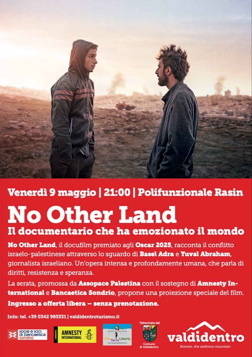 Una serata intensa, toccante, che fa riflettere. Venerdì 9 maggio, al Polifunzionale Rasin di Valdidentro (SO), arriva “No Other Land”, il documentario che ha fatto parlare il mondo intero, vincitore dell’Oscar 2025. Una proiezione speciale per guardare da vicino un conflitto che ci riguarda tutti, attraverso gli occhi di chi lo vive ogni giorno. 🎬🌍