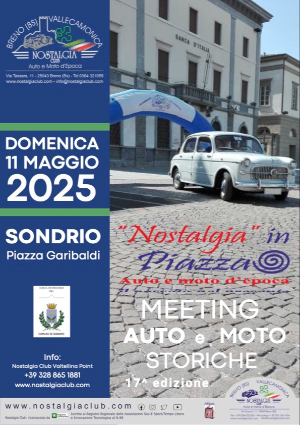 Un grande meeting di auto e moto storiche organizzato dal Nostalgia Club Valtellina Point, che porta nel centro città i modelli più amati del passato.
