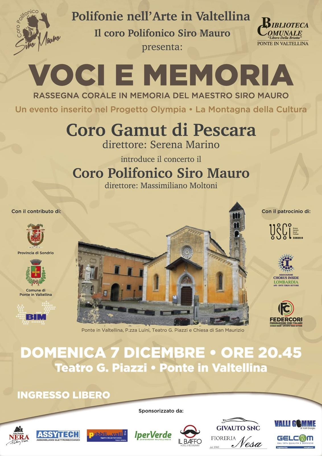 Una serata che unisce emozione e musica in un ricordo speciale. Domenica 7 dicembre, a Ponte in Valtellina (SO), appuntamento con “Voci e Memoria”, la rassegna corale organizzata in memoria del maestro Siro Mauro. L'evento si inserisce nel progetto culturale Olympia – La Montagna della Cultura.
