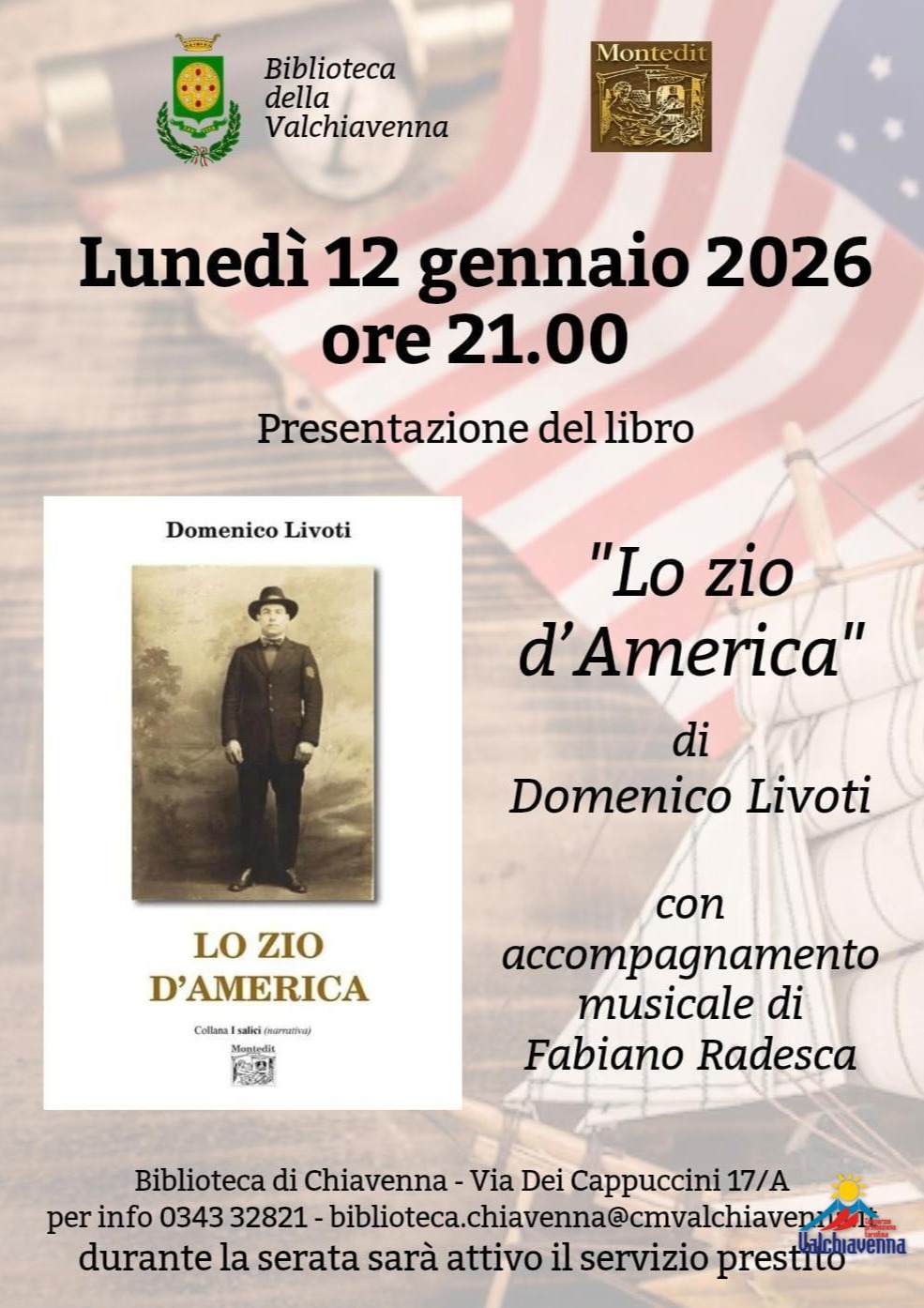 A Chiavenna la Biblioteca della Valchiavenna propone una serata tra narrativa e musica: lunedì 12 gennaio 2026 alle ore 21.00 è in programma la presentazione del libro “Lo zio d'America” di Domenico Livoti , con accompagnamento musicale di Fabiano Radesca .