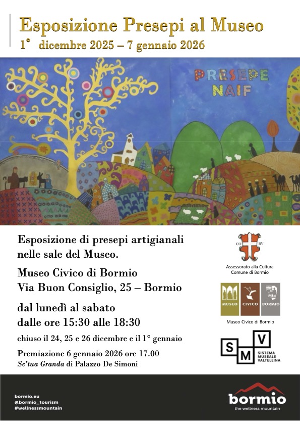 Al Museo Civico di Bormio , in via Buon Consiglio 25, torna l' Esposizione Presepi al Museo , mostra di presepi artigianali allestita nelle sale storiche. L'esposizione è visitabile dal 1 dicembre 2025 al 7 gennaio 2026 , dal lunedì al sabato dalle 15.30 alle 18.30, con chiusura il 24, 25, 26 dicembre e il 1 gennaio