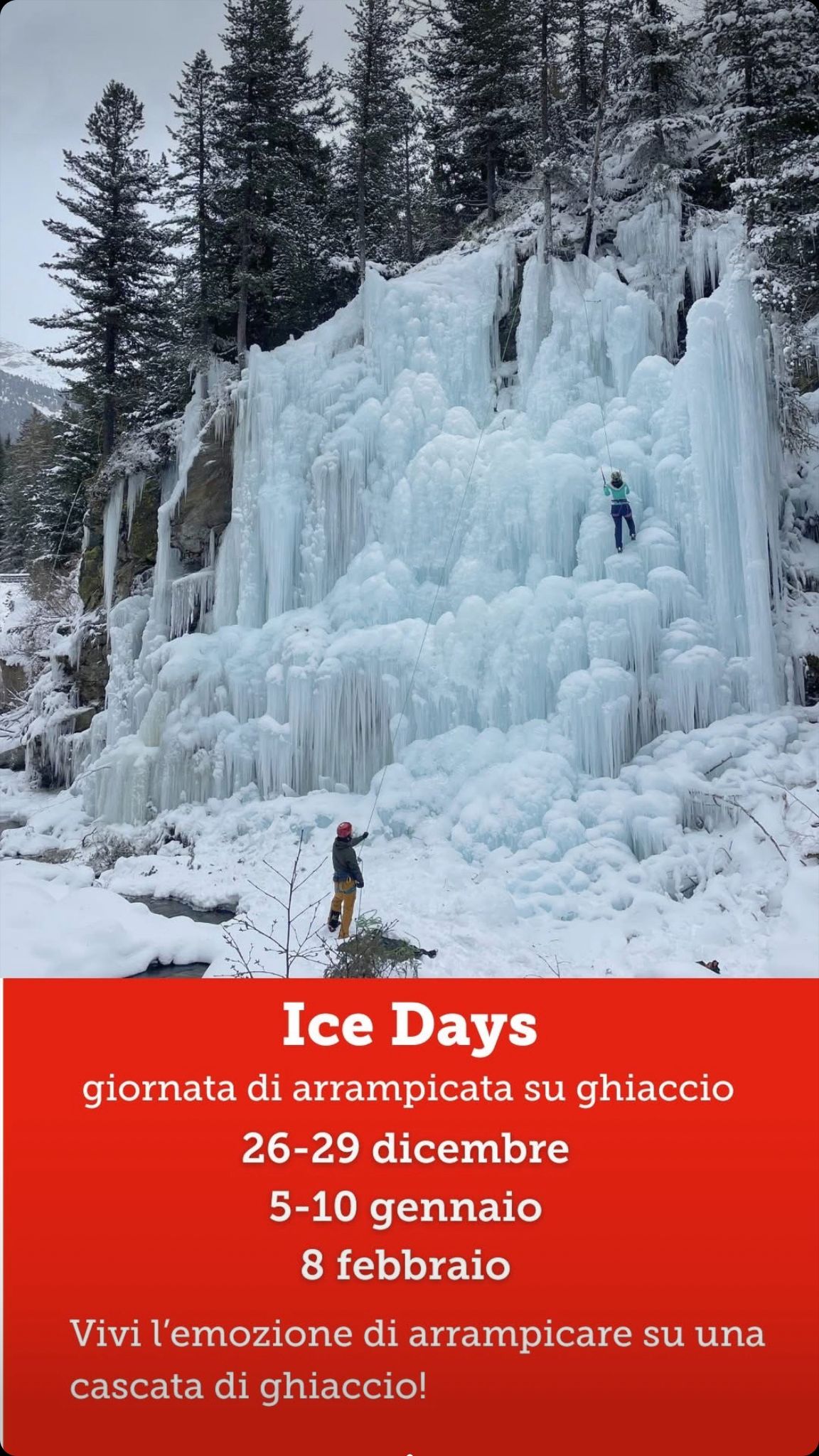 Il mercoledì è pensato per chi vuole iniziare: Arrampicata su ghiaccio First Time , con prime tecniche, tanta sicurezza e divertimento, per principianti , attrezzatura fornita e quota da 100,00 € .
