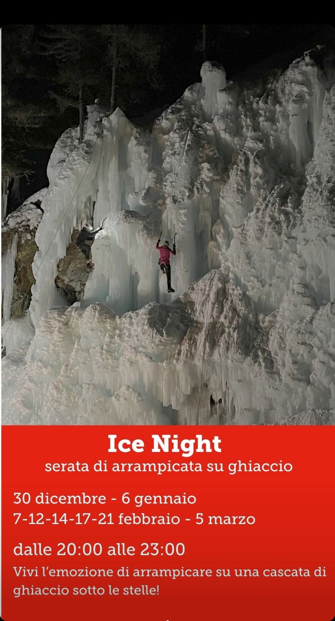 Durante la stagione sono previsti inoltre diversi eventi speciali : ciaspolate con cena in rifugio (27 dicembre, 30 dicembre, 3 gennaio), Ice Days – giornate di arrampicata su ghiaccio (26 e 29 dicembre, 5 e 10 gennaio, 8 febbraio) e Safety Camp (14 e 27 dicembre, 11 gennaio, 7 febbraio). Il calendario comprende anche uno “Speciale Olimpiadi” con Ice Nights – serate di arrampicata su ghiaccio il 7, 12, 14, 17 e 21 febbraio dalle 20.00 alle 23.00 e ciaspolate con cena in rifugio il 6, 8, 10, 13, 15, 17, 20 e 22 febbraio dalle 17.30 alle 22.30, oltre allo “Speciale San Valentino” con ciaspolata con cena in rifugio il 14 febbraio , tra boschi innevati e il calore di un rifugio.