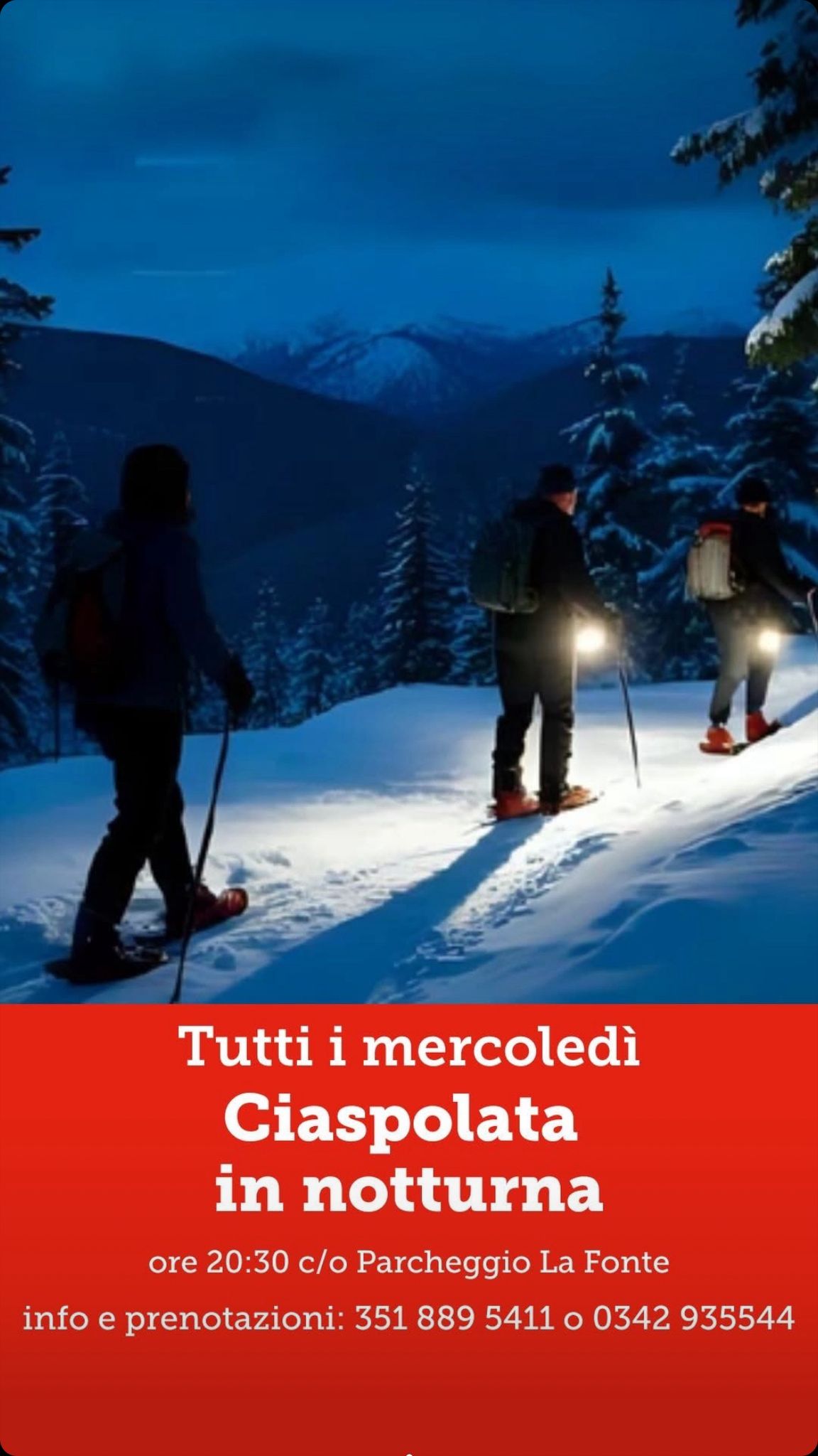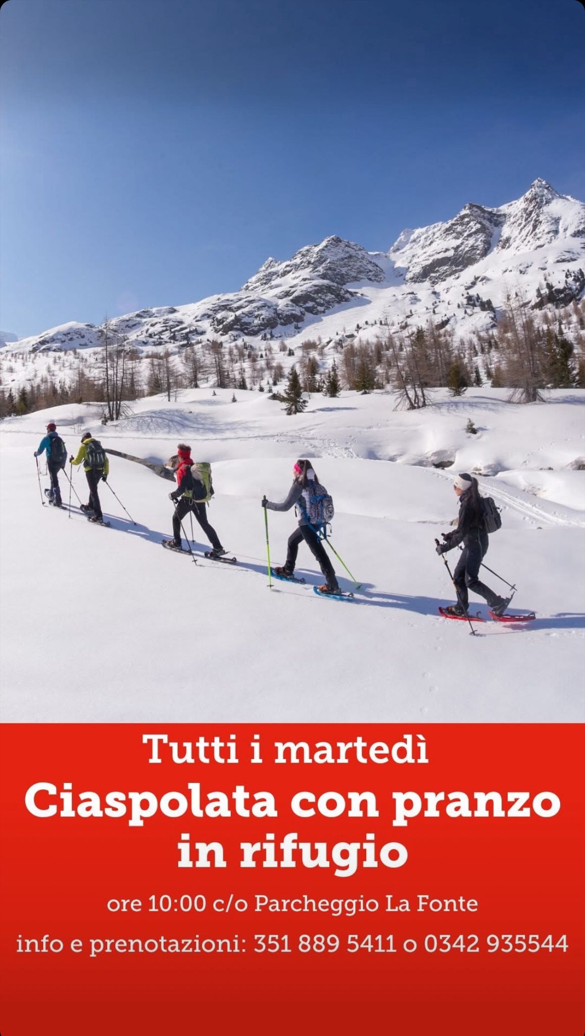 Il sabato si vendita di livello con il Freeride Alta Valtellina , discesa in neve fresca nella migliore ski area dell'alta valle per sciatori fuoripista , con kit autosoccorso obbligatorio e quota da 120,00 € , affiancato dalla ciaspolata collettiva di circa tre ore, adatto a tutti a 35,00 € .