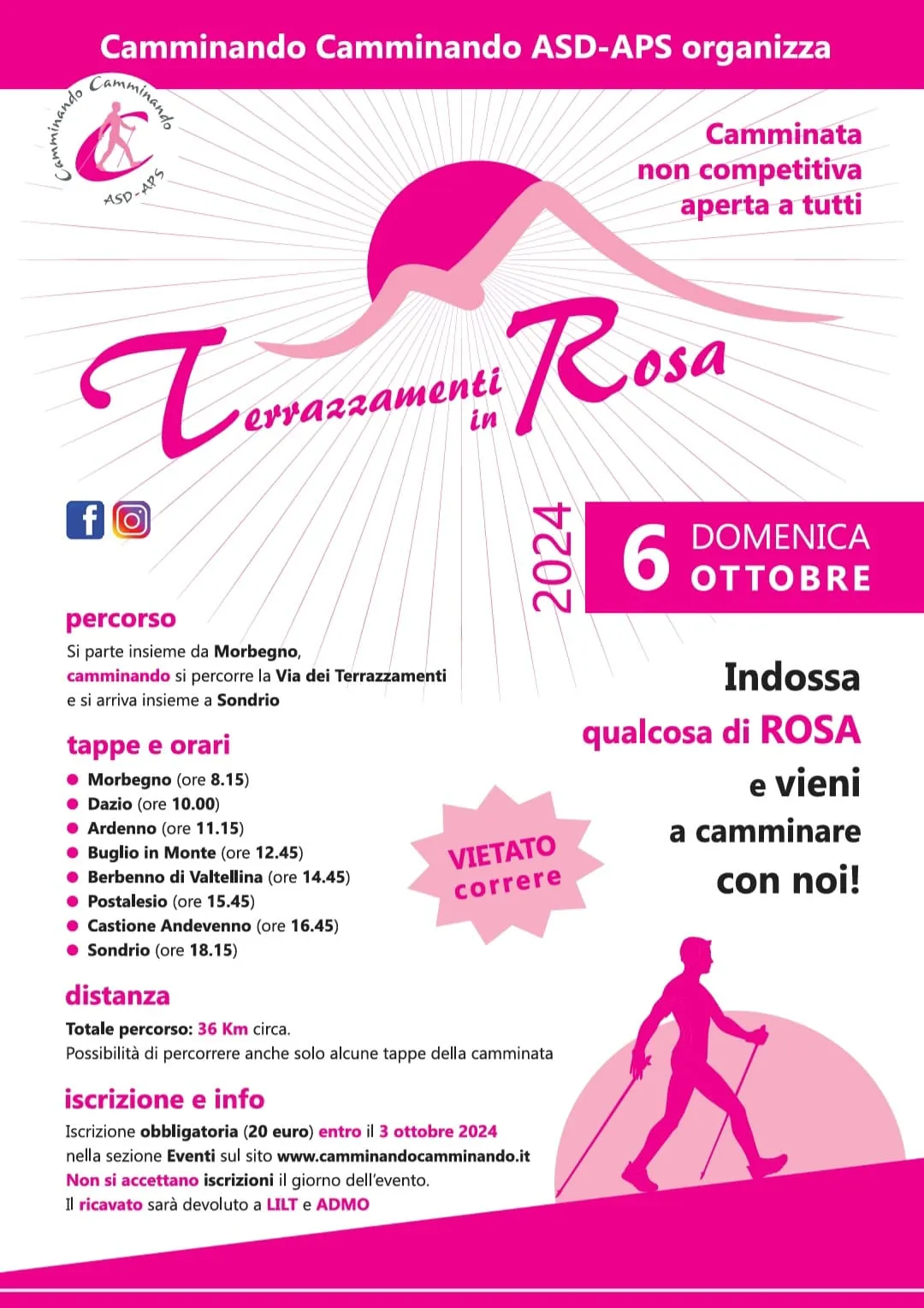 Nel mese dedicato alle campagne di sensibilizzazione ed educazione sui tumori, Camminando Camminando A.S.D. – A.P.S., propone una Camminata (dove è espressamente fatto divieto di correre) con partenza da Morbegno e arrivo a Sondrio in Piazza Garibaldi, percorrendo, per circa 36 chilometri con dislivello +1200 mt, in gran parte, la Via dei Terrazzamenti, per sostenere ADMO e LILT di Sondrio.