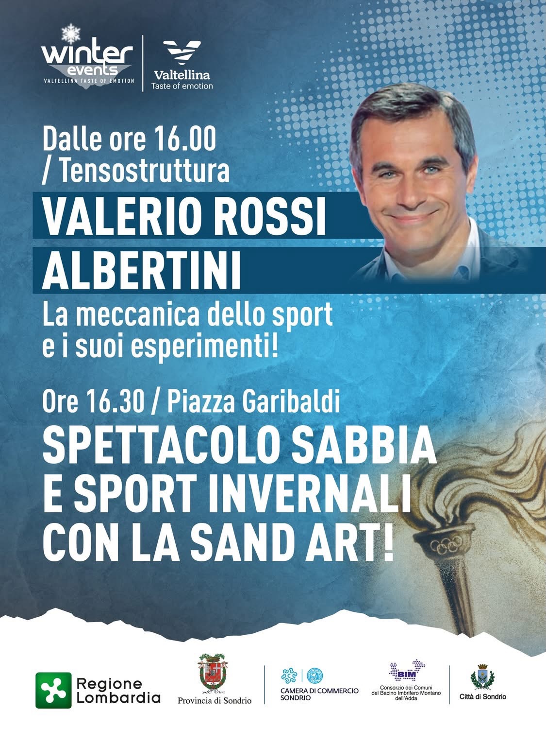 Una domenica ricca di eventi per tutte le età in Piazza Garibaldi a Sondrio: laboratori scientifici con Leoscienza, lo spettacolo educativo di Valerio Rossi Albertini sulla meccanica dello sport, suggestive performance di sand art a tema sport invernali e divertimento con baby dance. P