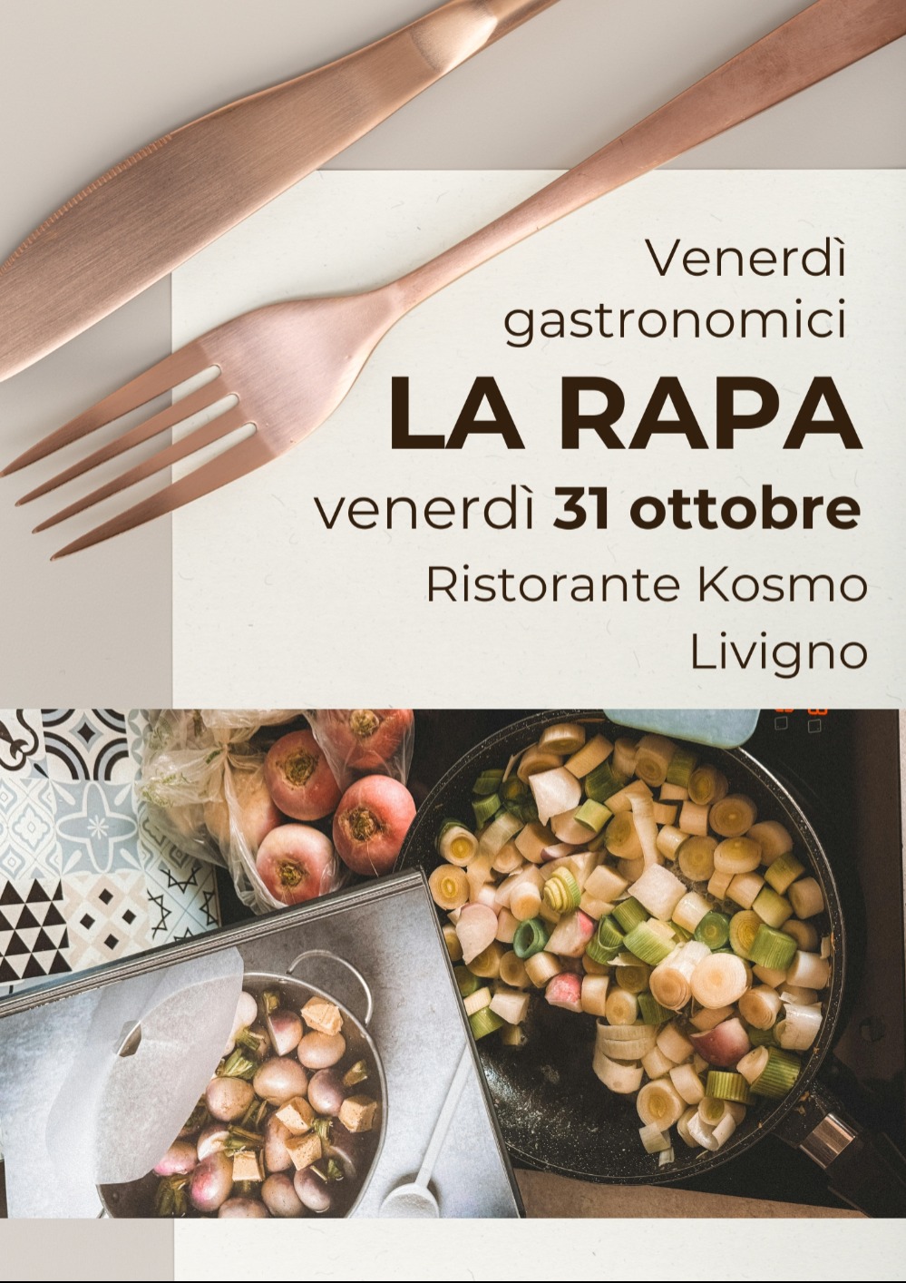 Un venerdì sera da veri intenditori. Il 31 ottobre 2025, Livigno ti aspetta con i sapori dell’autunno grazie ad un nuovo appuntamento dei Venerdì Gastronomici, questa volta dedicato a un ingrediente insolito ma ricco di gusto: la rapa. Insieme a pecora e mirtillo, sarà la protagonista di un percorso culinario originale e sorprendente.