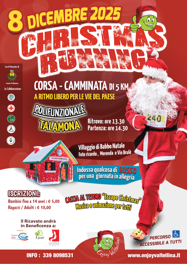 Lunedì 8 dicembre a Talamona torna la XIII Christmas Running: 5 km in costume natalizio tra sport, musica e solidarietà. Novità per i bambini con Escape Christmas.