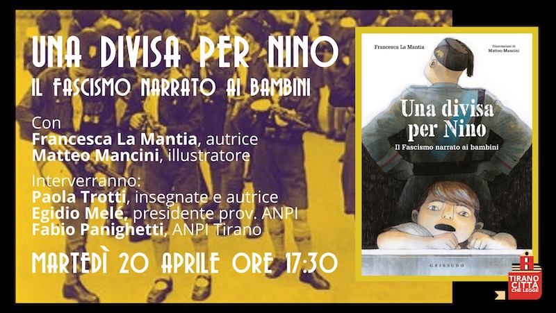 Come può un bimbo affascinato dalla divisa, dalla sicurezza e dalla forza che promana la figura del Duce, scegliere di non indossare quella divisa e di rifiutare ciò che il fascismo significa? La Mantia (autrice del testo) e Matteo Mancini ce lo raccontano dialogando con Paola Trotti, docente. Interverranno Egidio Melé, presidente dell'ANPI provinciale e Fabio Panighetti, responsabile sezione ANPI di Tirano.