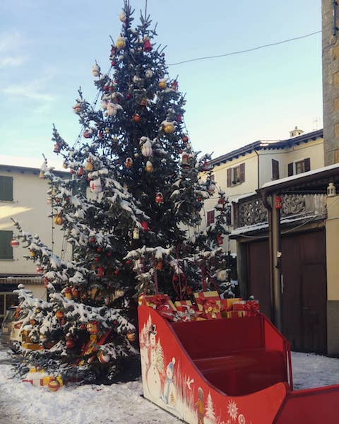 In piazza, infatti, sotto al maestoso albero di Natale decorato con mille lanterne e palline, è parcheggiata la slitta di Babbo Natale carica di doni, dove adulti e piccini possono scattare suggestive fotografie.