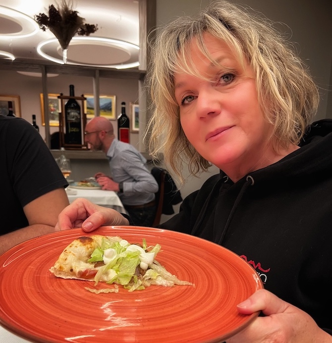 - Kebab KM0: pizza TondaClassica con spalmabile di fior di latte, arrosto d'agnello KM0, cipolla in crema, pomodorini, insalata croccante e salsa tzatziki.