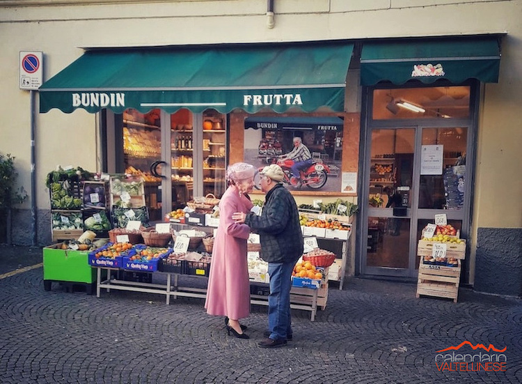 Davanti al negozio di Frutta del Bundin, si incontrano e si salutano due persone.