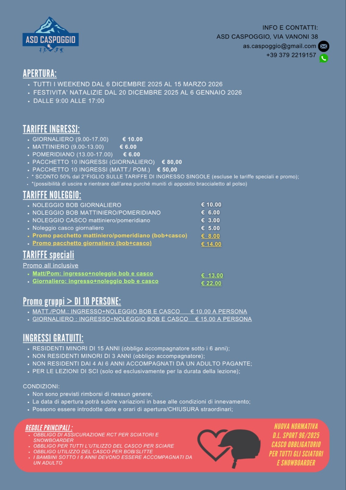 ⛷️ L’apertura può subire variazioni in base alle condizioni neve.