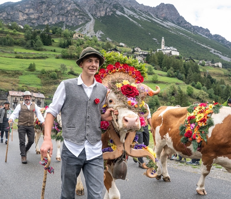Via alla sfilata degli allevatori e del bestiame lungo le vie del paese: un momento spettacolare tra costumi tradizionali, campanacci e decorazioni.