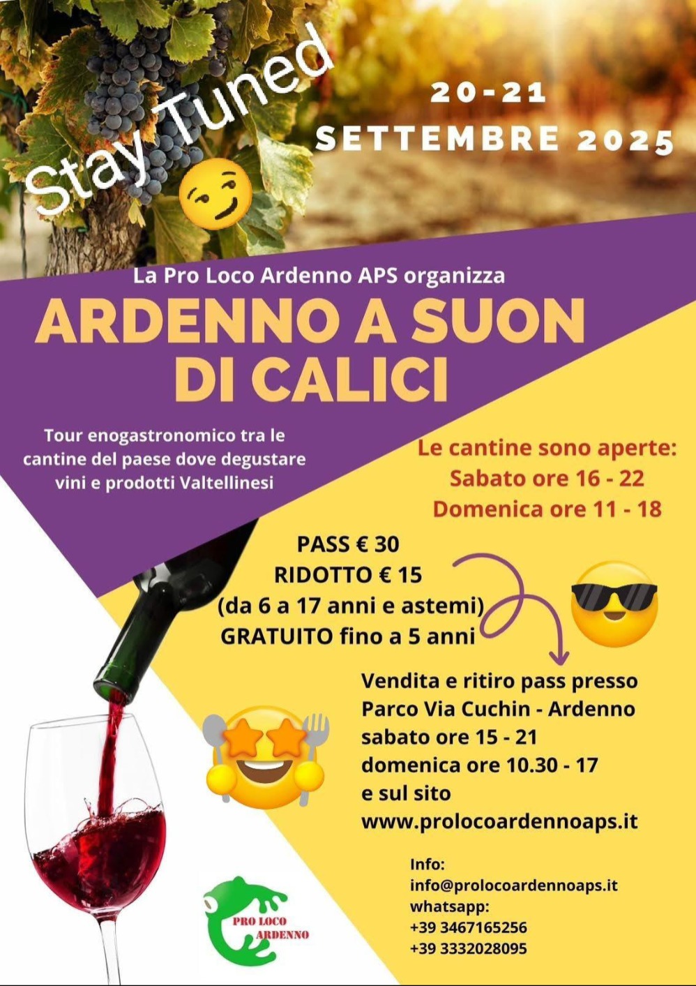 Segnati le date, perché il weekend del 20 e 21 settembre 2025 ad Ardenno (SO) si brinda con gusto! Torna l’evento “Ardenno a Suon di Calici”, il tour enogastronomico organizzato dalla Pro Loco Ardenno APS, perfetto per chi ama i vini locali e i sapori della Valtellina.