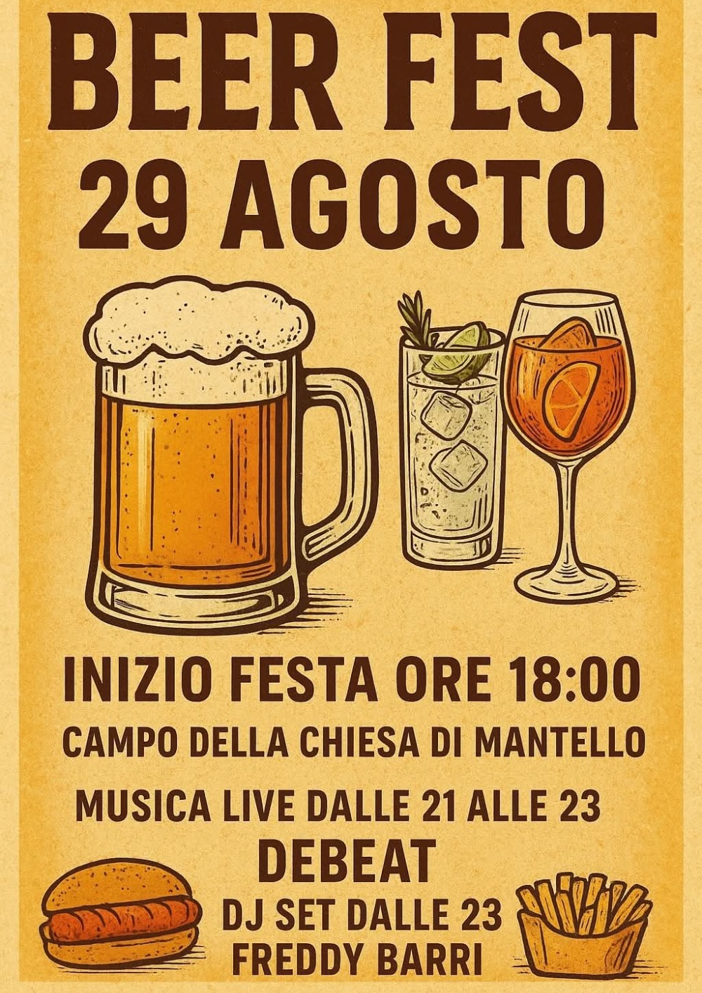 Venerdì 29 agosto 2025 al campo della chiesa di Mantello (SO) arriva il BEER FEST: una serata che unisce birra fresca, cibo sfizioso e tanta musica dal vivo.