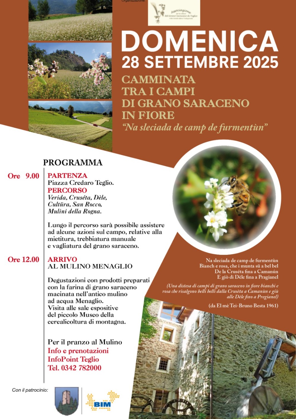 Domenica 28 settembre 2025 l’Associazione per la Promozione della Coltivazione del Grano Saraceno di Teglio organizza una camminata tra i campi in fiore, con dimostrazioni agricole e degustazioni.