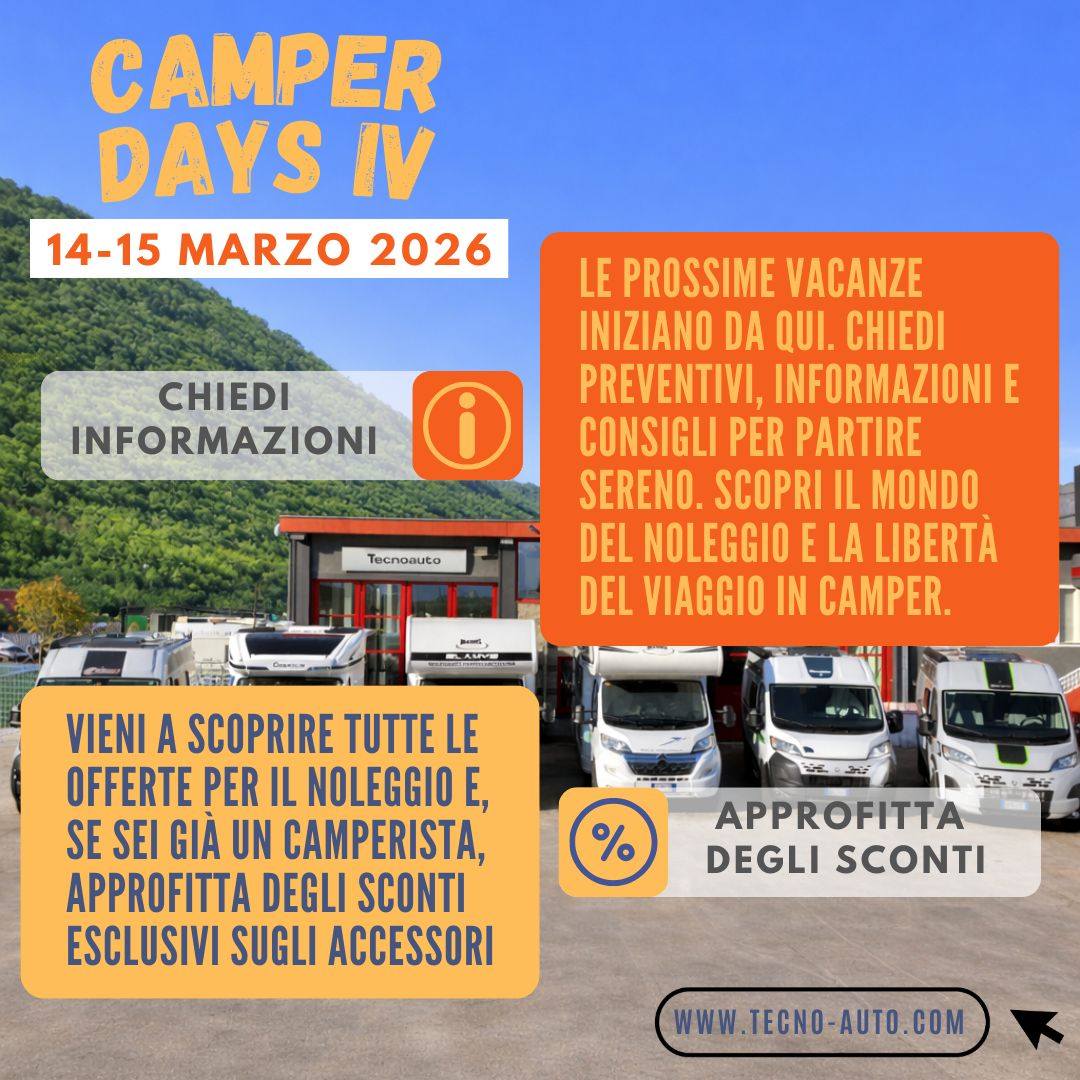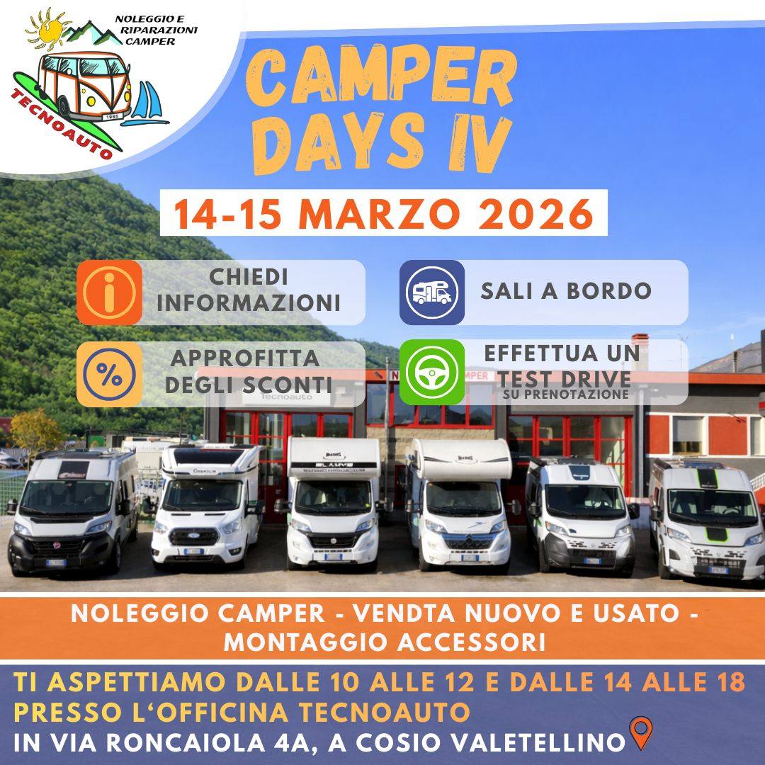 L’appuntamento è presso l’Officina Tecnoauto, in via Roncaiola 4A, Cosio Valtellino (SO). Durante l’evento potrai chiedere informazioni, richiedere preventivi e ricevere consigli utili per organizzare le prossime vacanze in modo sereno, esplorando il mondo del noleggio camper e delle soluzioni per viaggiare in autonomia.