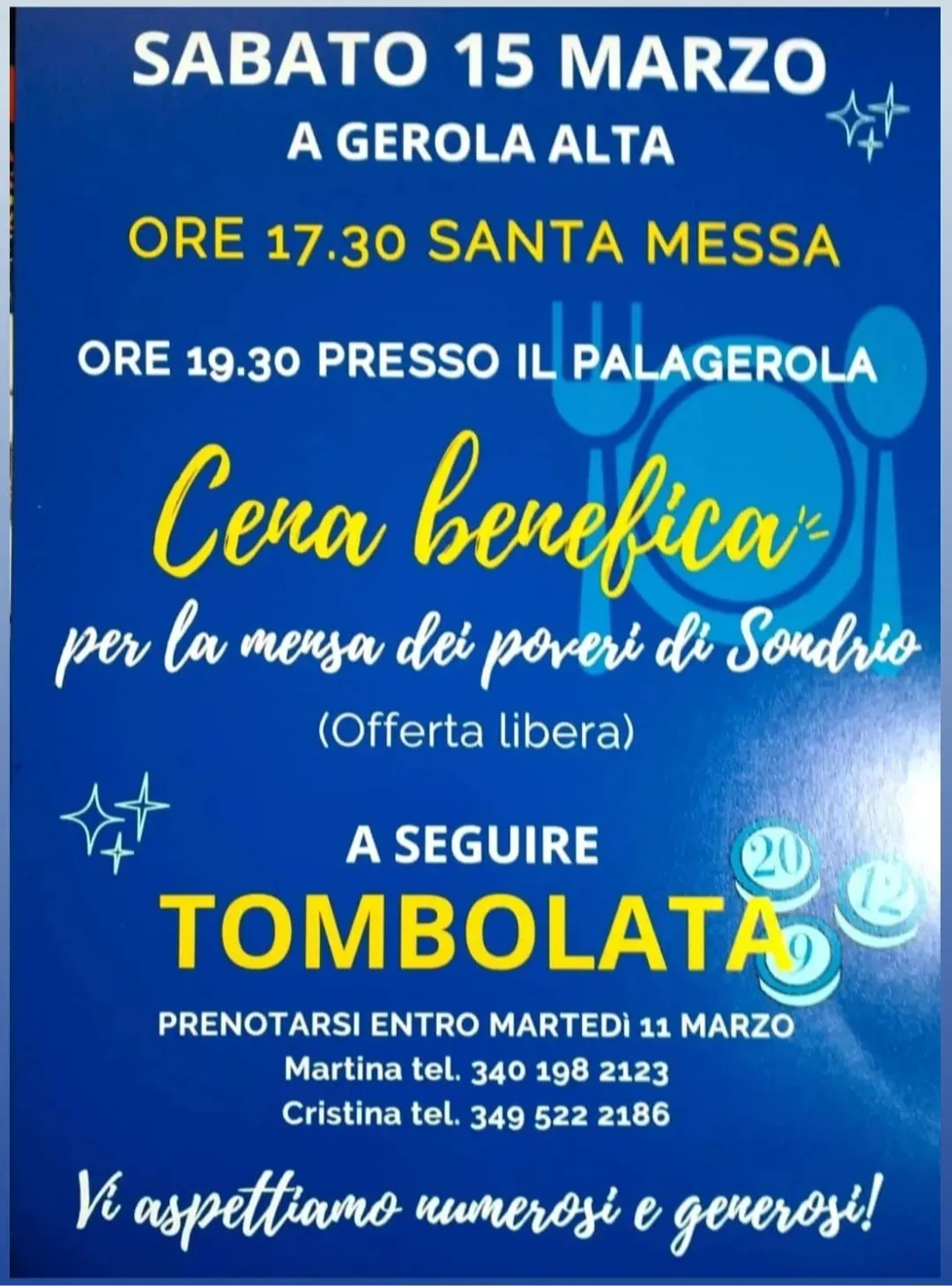 Cena benefica per la mensa dei poveri di Sondrio 15 marzo a Gerola Alta