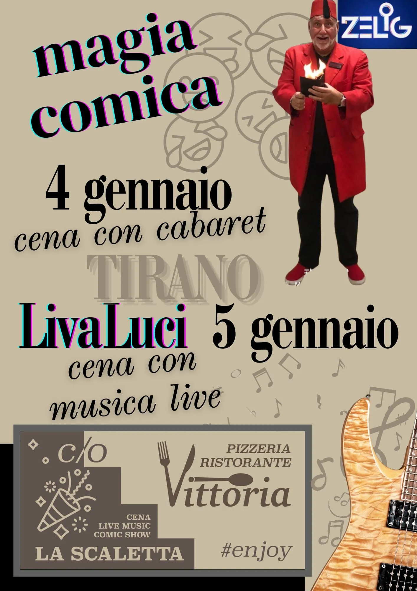 Ristorante Pizzeria Vittoria organizza Cena con cabaret a Tirano il 4 gennaio 2024 e Cena con musica live il 5 gennaio.