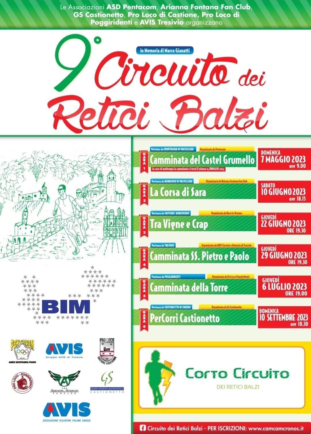 ASD Pentacom, Arianna Fontana Fan Club GS Castionetto Pro Loco di Castione e Poggiridenti, AGIS Tresivio organizzano Circuito Retici Balzi da maggio a settembre, 6 appuntamenti sportivi.
