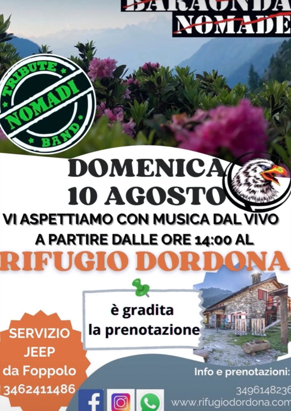 Musica dal vivo in alta quota con i Baraonda Nomade, tribute band dei Nomadi. Un pomeriggio speciale al Rifugio Dordona, tra panorami alpini e note senza tempo.