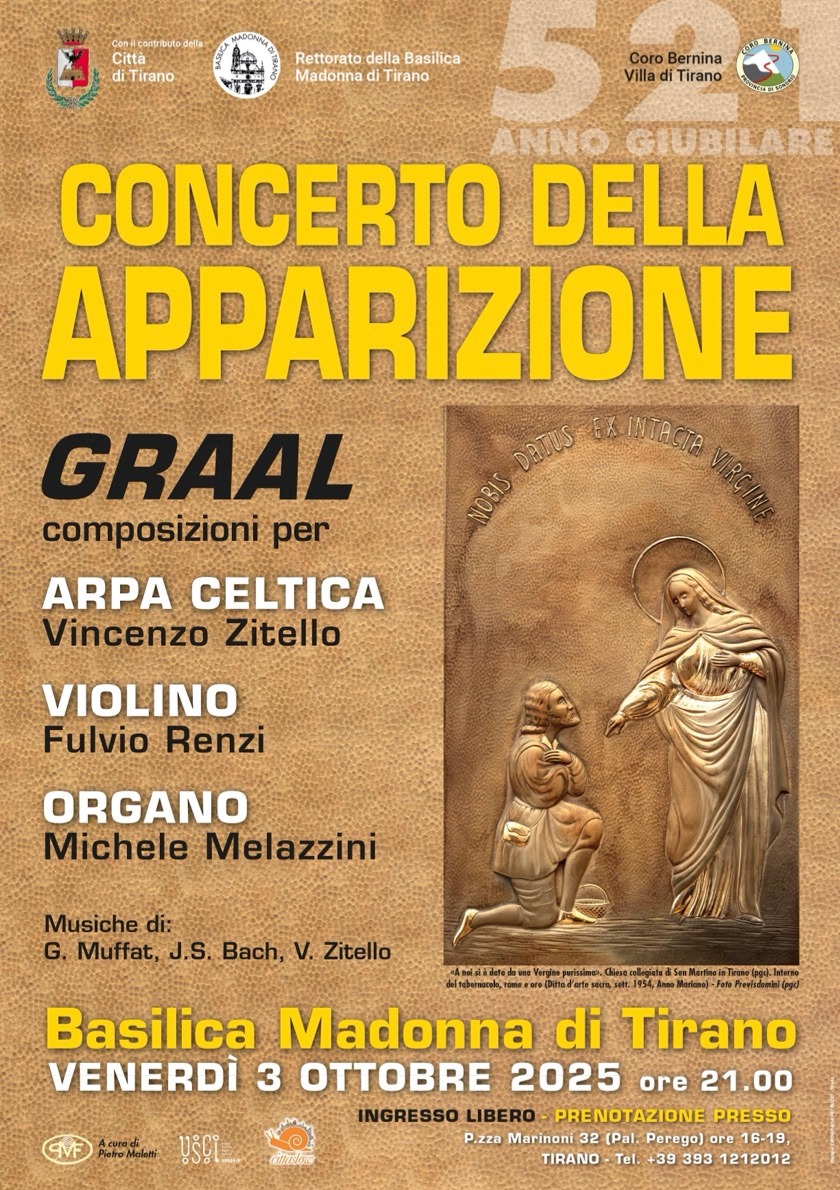 Venerdì 3 ottobre 2025, alle ore 21.00, la splendida Basilica Madonna di Tirano (SO) ospita il Concerto dell' Apparizione, inserito nelle celebrazioni del 525° Anno Giubilare.