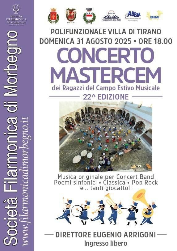 Hai voglia di un pomeriggio diverso, coinvolgente e pieno di musica dal vivo? Segnati questa data: domenica 31 agosto 2025 torna l’appuntamento con il Concerto Mastercem, l’evento conclusivo del Campo Estivo Musicale organizzato dalla Società Filarmonica di Morbegno. Un'occasione imperdibile per ascoltare giovani musicisti all’opera, in un’atmosfera unica e carica di energia.