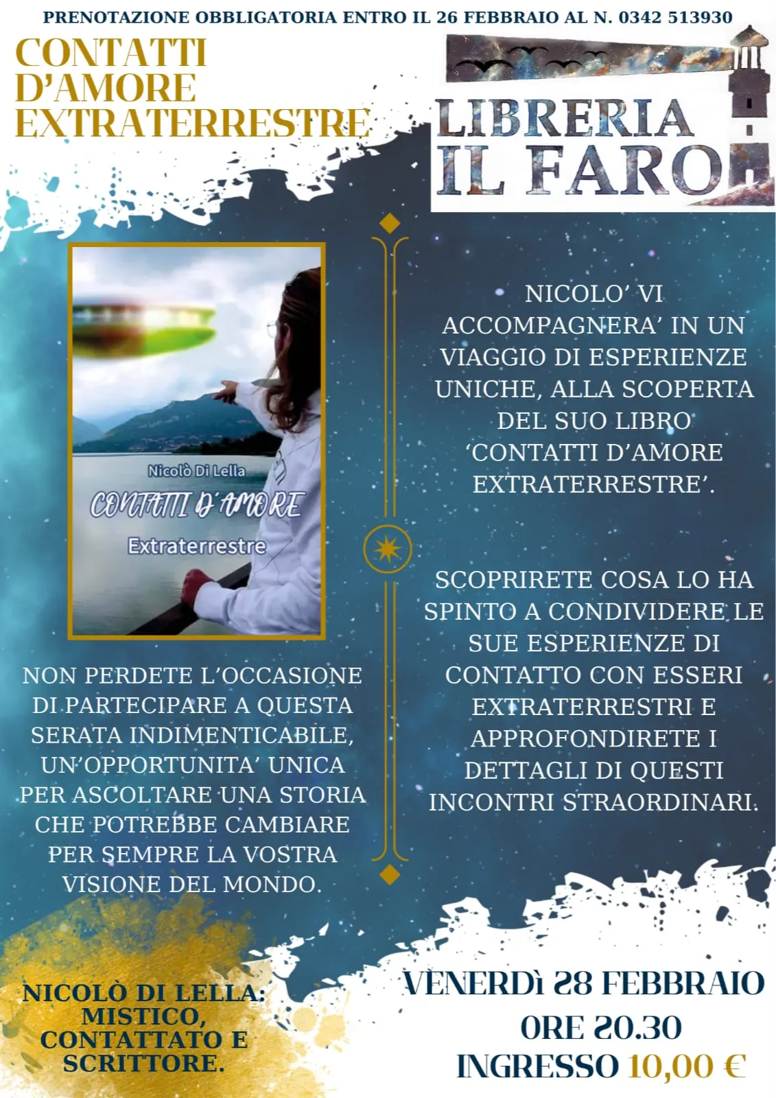 Il 28 febbraio, alle 20:30, la Libreria Il Faro di Sondrio ospita Nicolò Di Lella per la presentazione del suo libro Contatti d’amore extraterrestre.