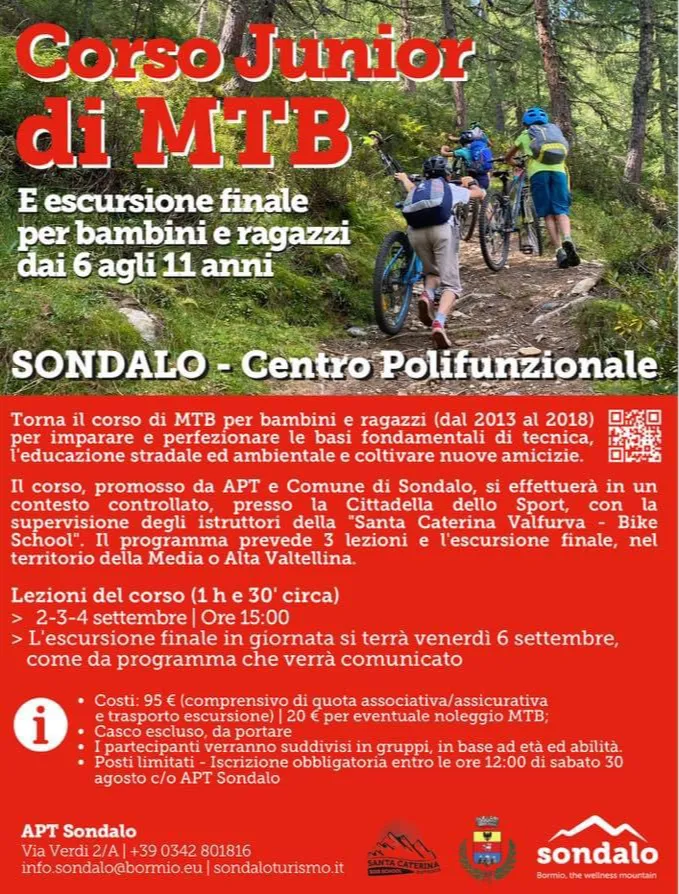 Il corso, promosso da APT e Comune di Sodalo, si effettuerà in un contesto controllato, presso la Cittadella dello Sport con la supervisione degli istruttori della Santa Caterina Valfurva Bike School". Il programma prevede 3 lezioni e l'escursione finale nel territorio della Media o Alta Valtellina.